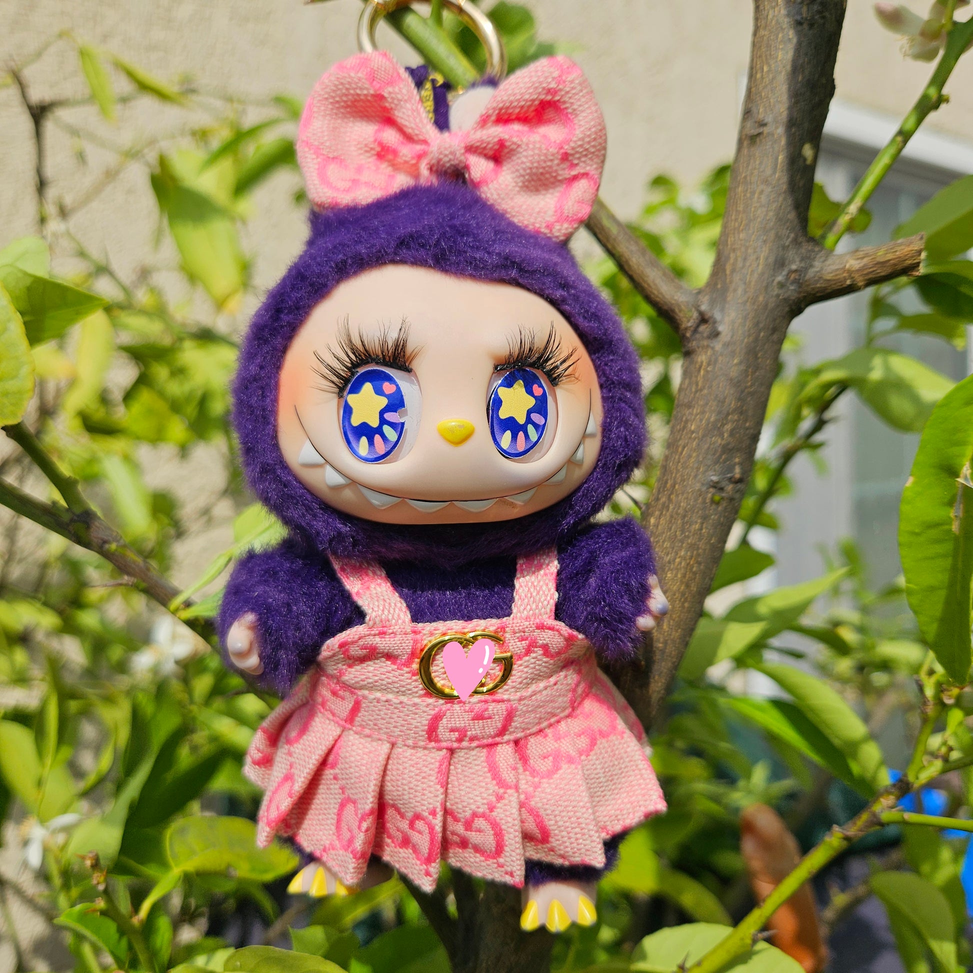 Monogram outfit featuring a logo print on both the pleated skirt and matching bow. The material has a subtle sheen and the outfit gives the Labubu a designer-inspired, playful look.