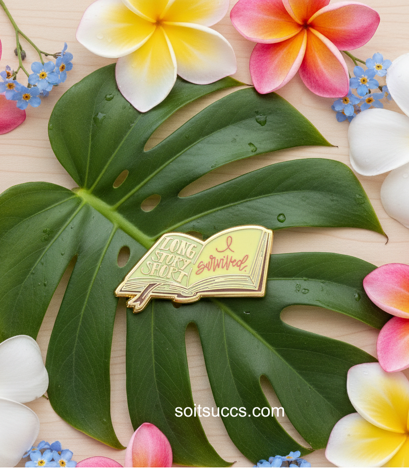Our "Long Story Short, I Survived" enamel pin is a witty and resilient badge of honor. Shaped like an open book, it perfectly captures the journey of life—sometimes a saga, sometimes a single, powerful statement. The vibrant pink ribbon subtly woven into the "I Survived" side adds a layer of depth, symbolizing strength, awareness, and the enduring human spirit.